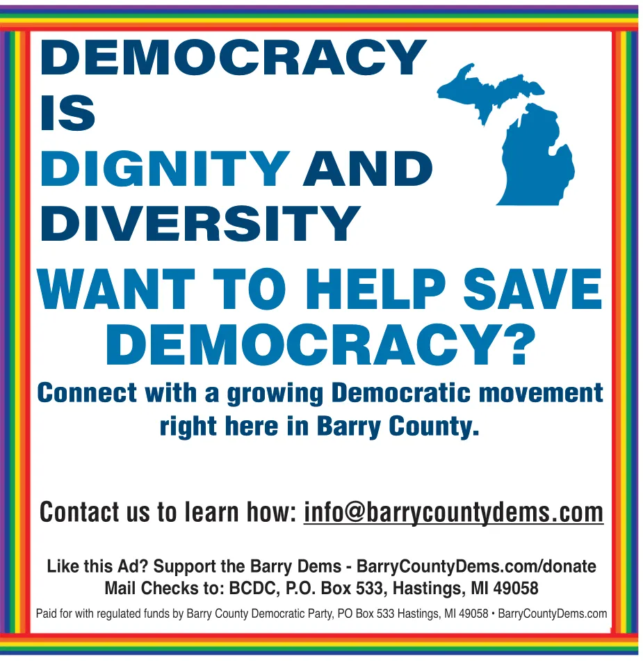 Democracy is DignityBarry County Dems | Posted on July 29, 2024 | Downloads PDF: https://barrycountydems.com/wp-content/uploads/2024/07/Democracy-Dignity-ad-4.pdf Post Navigation ← Previous Post