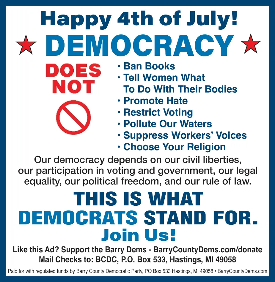 Happy 4th of JulyBarry County Dems | Posted on July 29, 2024 | Downloads PDF: https://barrycountydems.com/wp-content/uploads/2024/07/4th-of-July-ad-3.pdf Post Navigation ← Previous PostNext Post →